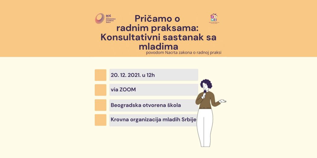 Zašto baš ti moraš da se uključiš u javnu raspravu u vezi Zakona o radnoj praksi? Zato što će ovaj zakon imati efekte po tvoja prva radna iskustva, radna prava, kao i unapređenje zapošljivosti. Dođi na naš onlajn konsultativni sastanak koji organizujemo uz podršku KOMS-a sa mladima u ponedeljak 20. decembra gde ćemo diskutovati o Nacrtu zakona o radnoj praksi i upoznati te sa njegovim specifičnostima.