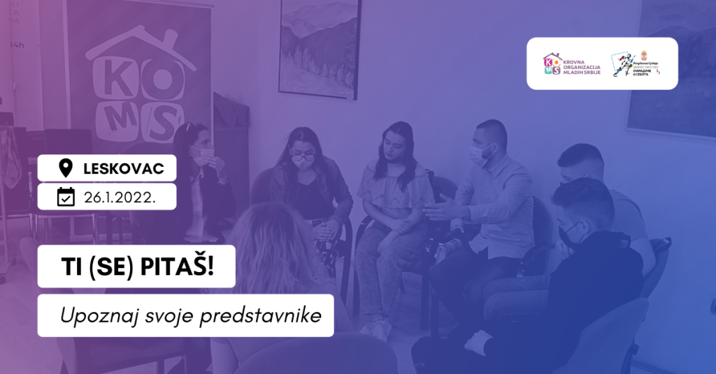 Krovna organizacija mladih Srbije uz podršku Ministarstva omladine i sporta Republike Srbije organizuje događaj Upoznaj svoje predstavnike. Ti (se) pitaš! 26. januara od 13h u Centru za stručno usavršavanje u obrazovanju (Leskovačkog Odreda 6) u Leskovcu. Cilj događaja je da se mladi iz Leskovca i drugih mesta sa juga Srbije bliže upoznaju sa radom KOMS-a i informišu se o programima i projektima koje KOMS sprovodi. Takođe, ovo je i šansa da mladi upoznaju predstavnike KOMS-a i relevantnih saradnika i da zajedno mapiraju položaj i potrebe mladih u svojim zajednicama.